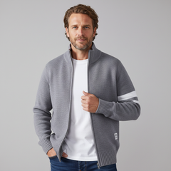 A modern wool-blend sweater with a clean zip-front design, finished with subtle stripe detailing for a sporty, pulled-together look.